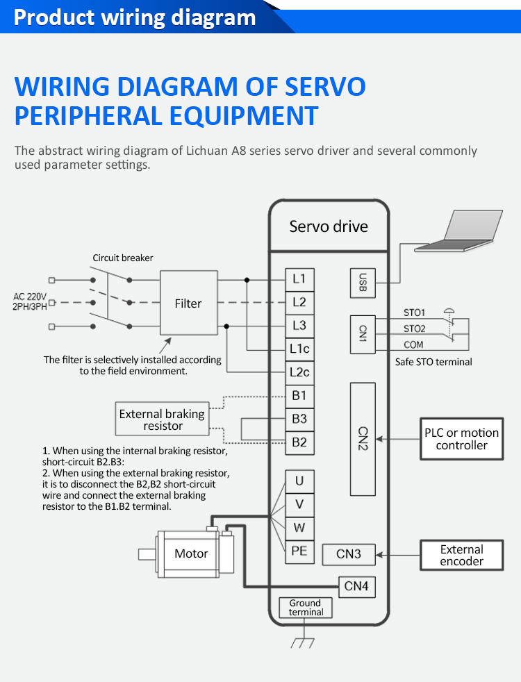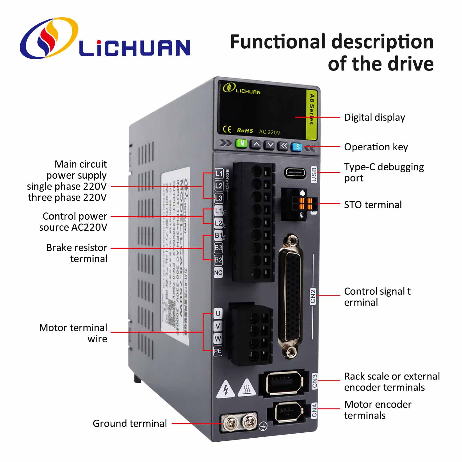 ఈ సిరీస్ IEC 61800-5-2 భద్రతా ప్రమాణాలకు అనుగుణంగా ఉండే ఇంటిగ్రేటెడ్ STO (సేఫ్ టార్క్ ఆఫ్) సేఫ్టీ టార్క్ షట్డౌన్ ఫంక్షన్తో కూడిన అధిక-పనితీరు గల AC సర్వో డ్రైవ్. సిస్టమ్ పూర్తి క్లోజ్డ్-లూప్ కంట్రోల్ మోడ్కు మద్దతు ఇస్తుంది మరియు హై-రిజల్యూషన్ ఎన్కోడర్ ఫీడ్బ్యాక్ ద్వారా ± వన్ పల్స్ యొక్క పొజిషనింగ్ ఖచ్చితత్వాన్ని సాధిస్తుంది, ఇది తిరిగే మోటార్లు మరియు లీనియర్ మోటార్ అప్లికేషన్ దృశ్యాలకు అనుకూలంగా ఉంటుంది. ఇది టైప్-సి డీబగ్గింగ్ ఇంటర్ఫేస్తో అమర్చబడి ఉంది, రియల్-టైమ్ పారామీటర్ కాన్ఫిగరేషన్కు మద్దతు ఇస్తుంది మరియు అంతర్నిర్మిత RS485 కమ్యూనికేషన్ ఇంటర్ఫేస్ (Modbus RTU ప్రోటోకాల్)ని కలిగి ఉంది మరియు బాడ్ రేటును 9.6kbps~115.2kbps నుండి సర్దుబాటు చేయవచ్చు. ఇది మాగ్నెటిక్ ఫీల్డ్ ఓరియంటేషన్ కంట్రోల్ (FOC) అల్గారిథమ్ను స్వీకరిస్తుంది, ఇది ఖచ్చితమైన CNC మరియు సెమీకండక్టర్ పరికరాలు వంటి అధిక-డైనమిక్ ప్రతిస్పందన సందర్భాలలో అనుకూలంగా ఉంటుంది.